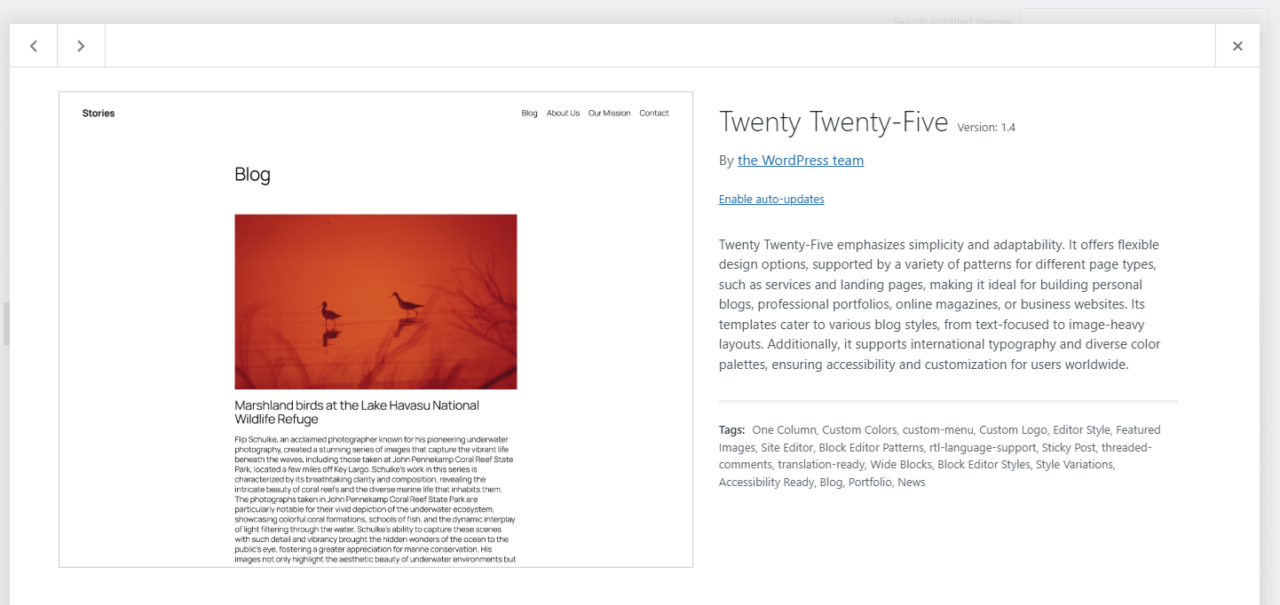 Description: Twenty Twenty-Five emphasizes simplicity and adaptability. It offers flexible design options, supported by a variety of patterns for different page types, such as services and landing pages, making it ideal for building personal blogs, professional portfolios, online magazines, or business websites. Its templates cater to various blog styles, from text-focused to image-heavy layouts. Additionally, it supports international typography and diverse color palettes, ensuring accessibility and customization for users worldwide.